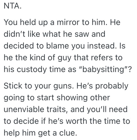 Reddit users weighed in on the situation, offering various perspectives. Some believed she wasn’t at fault (NTA), while others had different opinions. One user suggested that the man might need to work on his own issues, while another emphasized the importance of understanding different parenting styles.