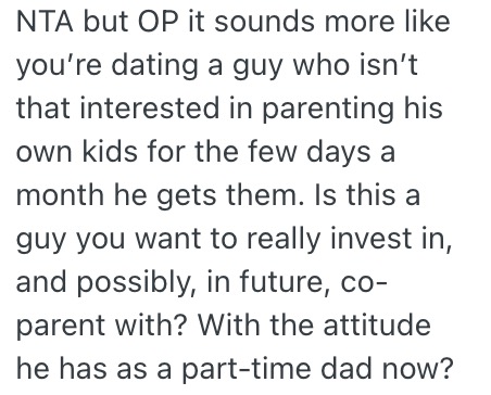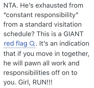 The woman, a 25-year-old, recently started dating a 30-year-old man she has known for two years. Both are single parents, each juggling work, studies, and parenting duties. The man has two children, aged 4 and 6, and spends two days a week with them, plus every other weekend. Meanwhile, the woman has full custody of her 2-year-old child and has been responsible for them since birth.