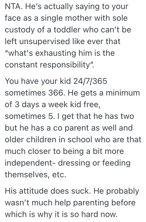 She also felt hurt by his comment that she “doesn’t get it,” given that she has had 24/7 responsibility for her child since birth, with no evenings or weekends to herself. This led her to question whether he truly understands the challenges she faces.