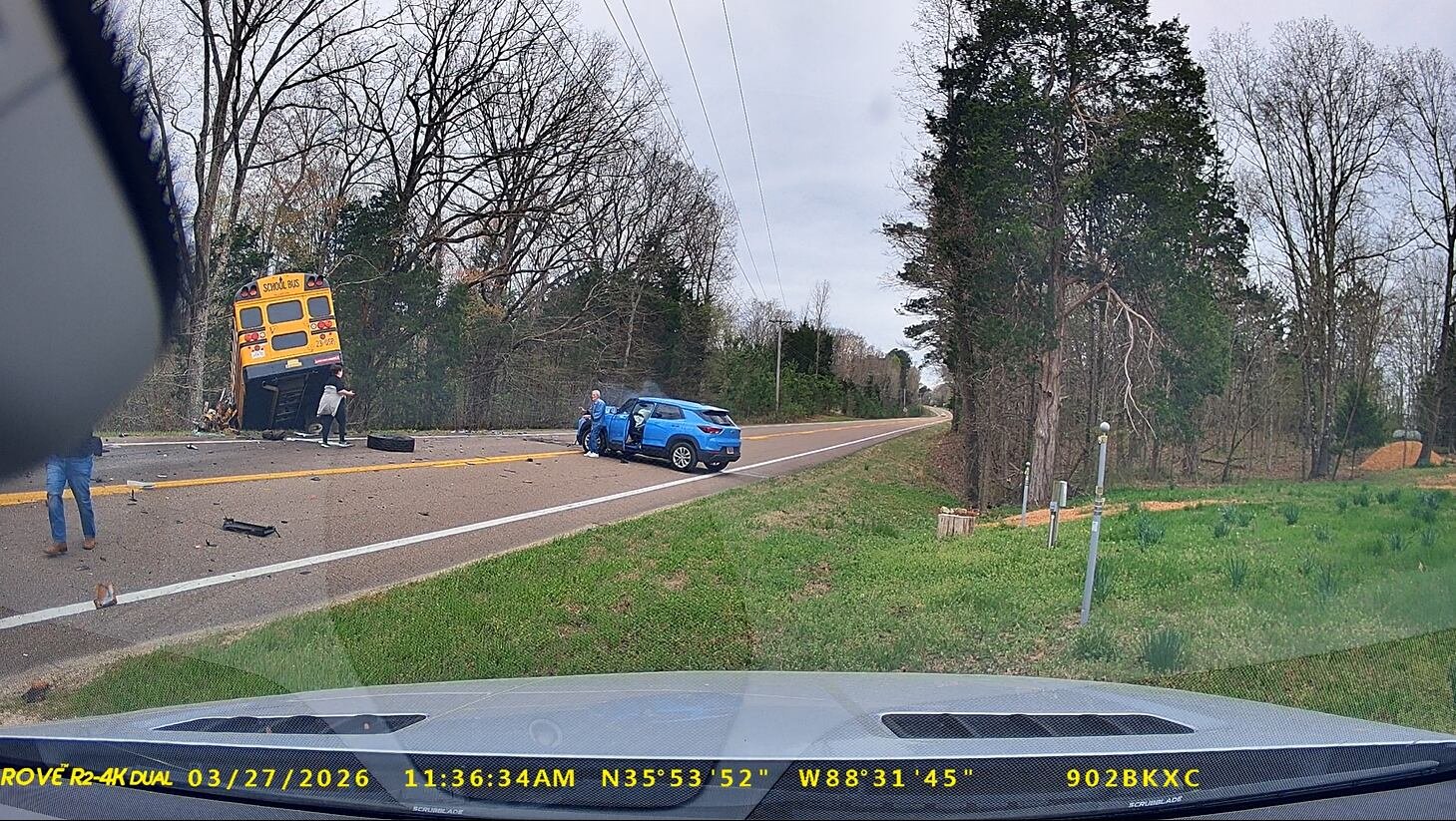 Dash camera footage of the crash shows the school bus crossing the center line and colliding head-on with a dump truck. The bus then struck an SUV before flipping into a ditch.