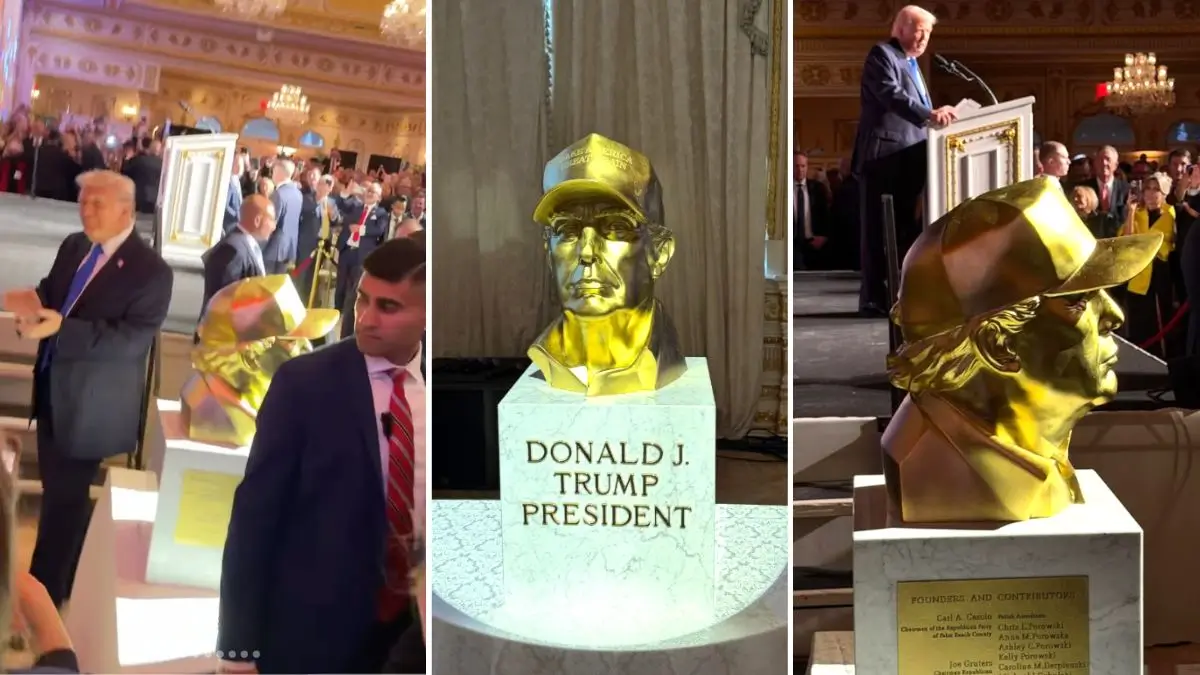 During this time, Trump made an appearance at the Republican Party of Palm Beach’s Abraham Lincoln Day Gala on March 20, where he was the special guest. The event featured a unique display that caught the attention of many: a gold sculpture of Trump, complete with his signature hat, collar shirt, and suit jacket. The statue, which was placed on a marble stand engraved with names of Republican founders and contributors, drew both admiration and criticism.
